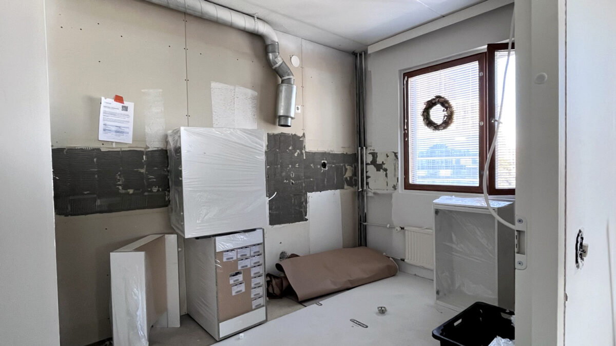 – Olimme suosiolla viikon asumassa muualla ja toisen viikon poissa lomalla. Kotona olisimme olleet turhaan remontoijien tiellä. Palasimme kotiin, kun suurimmat kalusteet oli asennettu ja lattiat valmiit. Remontin aikana asunnossa ei käytännössä pysty asumaan – meteli on kova ja tavaroita siirrellään jatkuvasti.