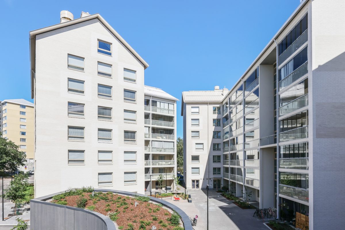 on myös huoneistosauna. Osa ylimmän kerroksen asunnoista jatkuu ullakkokerrokseen.