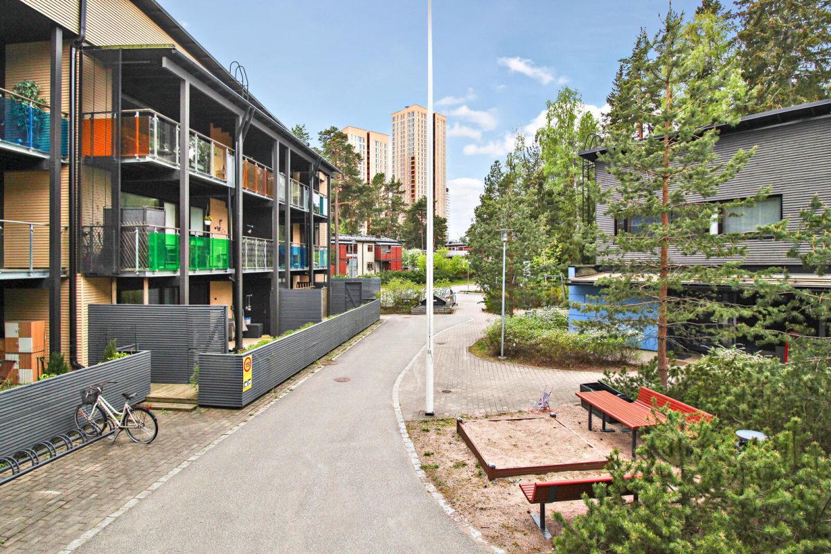 Vuosaaren Haso Omenamäenkatu 5:n värikkäät parvekkeet ilahduttavat ja saavat hyvälle tuulelle. Kohde koostuu kahdesta kerrostalosta ja paritalosta ja koteja on yhteensä 74.