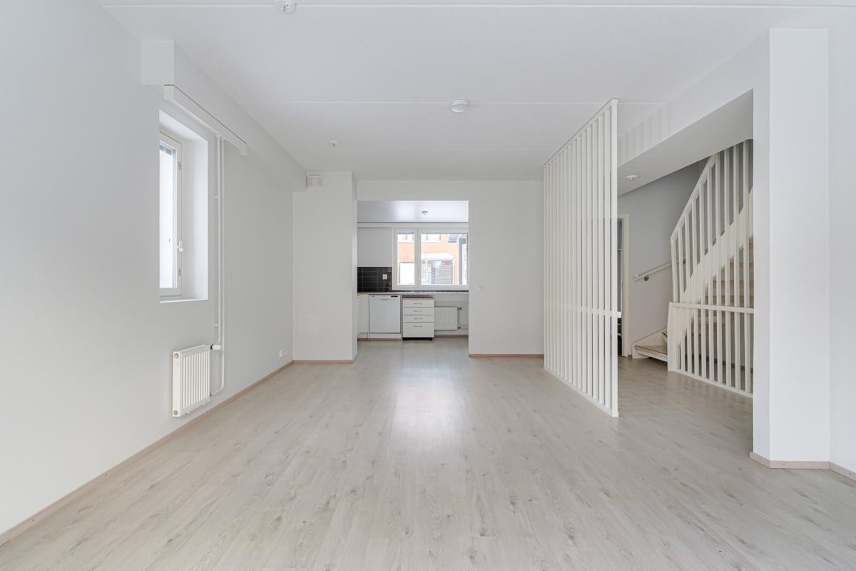 Kahteen tasoon sijoittuva rivitalokoti tekee arjesta sujuvaa ja stressitöntä. Alakerrassa on tilava keittiö, jossa on helppo kokkailla koko perheelle ja jossa kaappi- ja laskutilaa on juuri sopivasti. Kaksi korkeaa kylmäkalustetta tekevät viikon ruokien ostamisesta helppoa. Valoisa olohuone kutsuu viettämään yhteisiä hetkiä ja sieltä pääsee suoraan omalle terassille ja vehreälle pihalle – täydellinen paikka lasten leikeille ja vanhempien kahvihetkille.