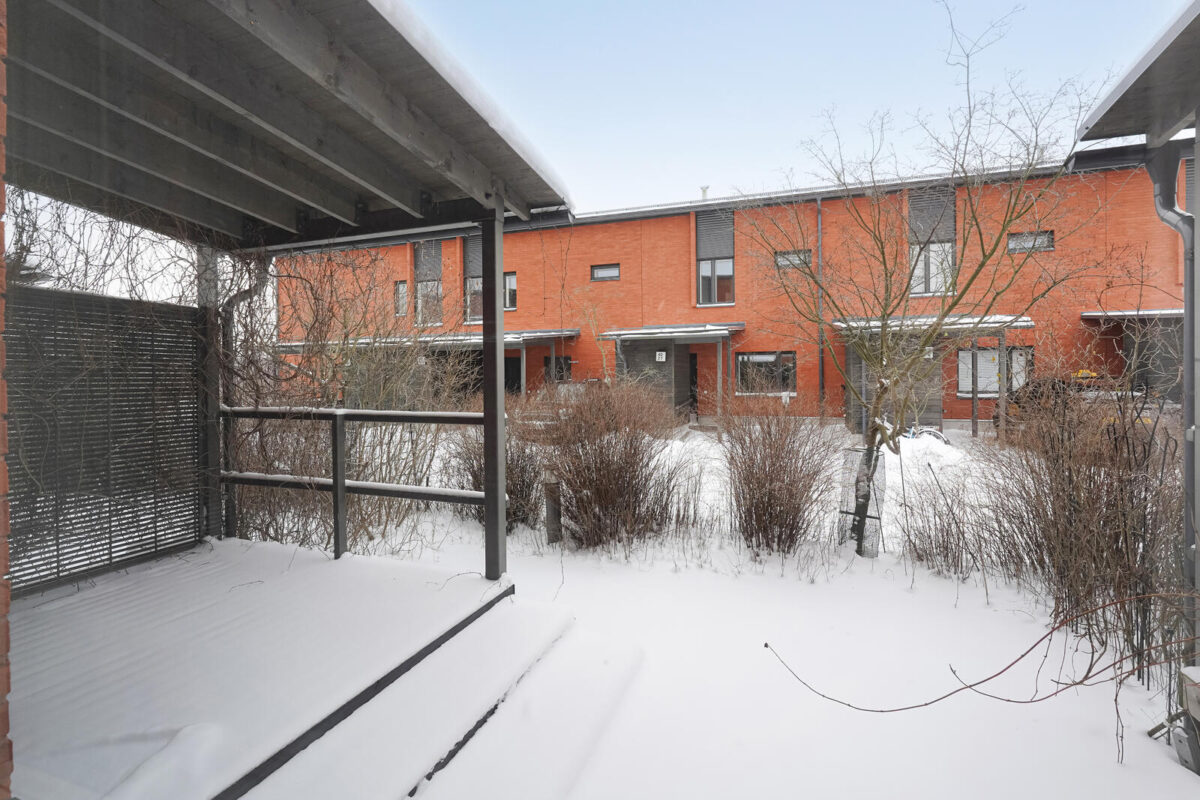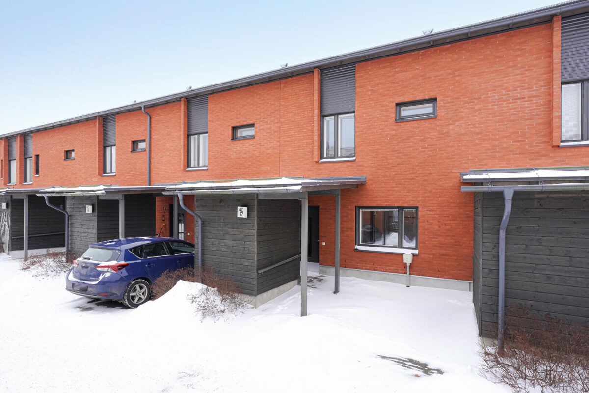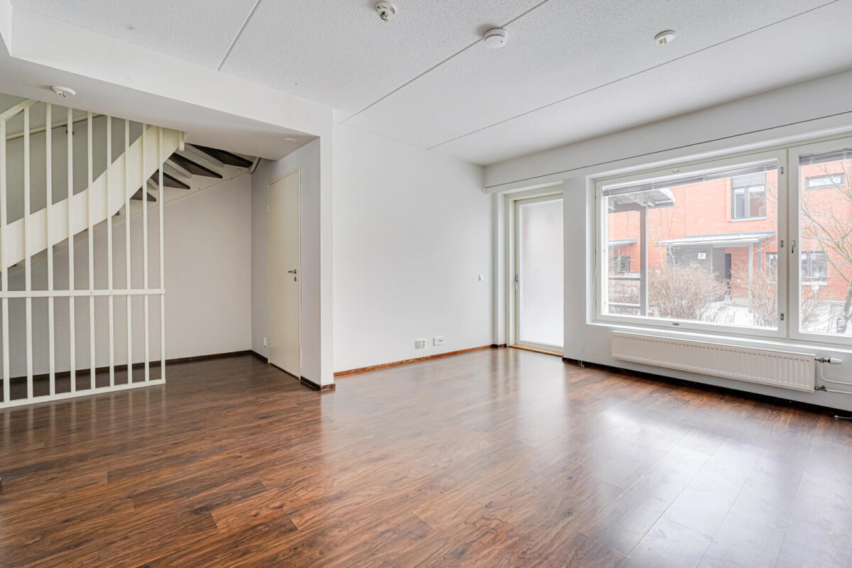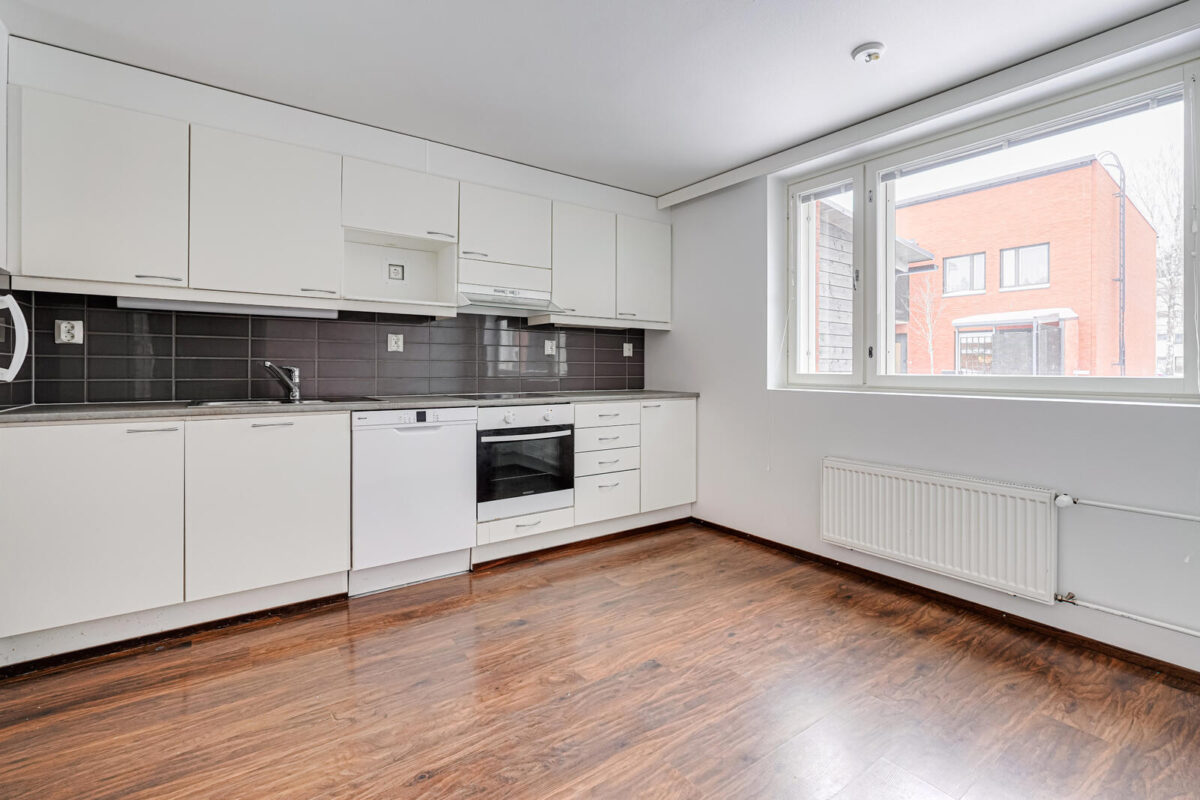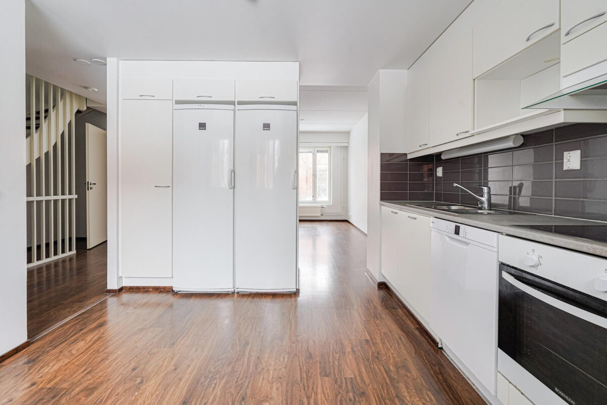 Kahteen tasoon sijoittuva rivitalokoti tekee arjesta sujuvaa ja stressitöntä. Kodin tummat lattiamateriaalit tuovat kotiin ilmeikkyyttä ja kodin valkoiset seinät ovat valmiit omille maalivalinnoillesi. Alakerrassa on tilava keittiö, jossa on helppo kokkailla koko perheelle ja jossa kaappi- ja laskutilaa on juuri sopivasti. Kaksi korkeaa kylmäkalustetta tekevät viikon ruokien ostamisesta helppoa. Valoisa olohuone kutsuu viettämään yhteisiä hetkiä ja sieltä pääsee suoraan omalle terassille ja vehreälle pihalle – täydellinen paikka lasten leikeille ja vanhempien kahvihetkille.