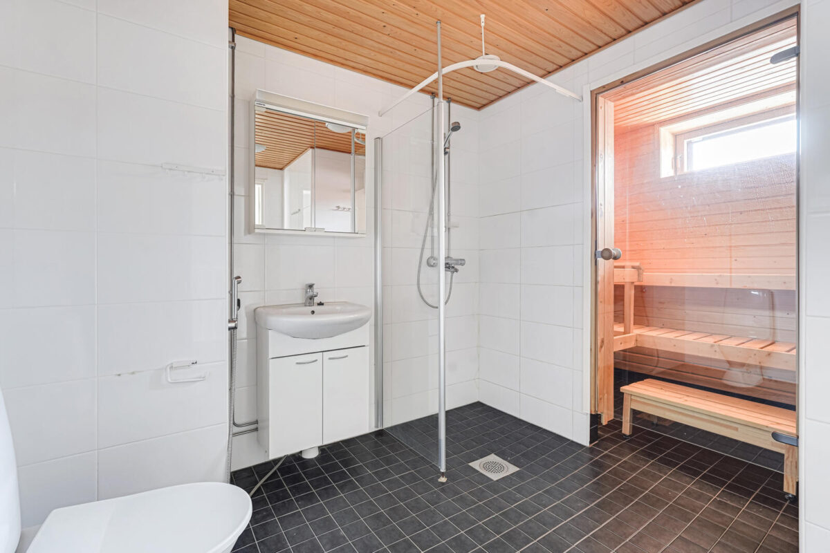 Yläkerrassa odottavat oma sauna sekä kolme eri kokoista makuuhuonetta, joista jokaiselle perheenjäsenelle löytyy oma rauhallinen tila. Yhdessä makuuhuoneessa on mukava ranskalainen parveke.