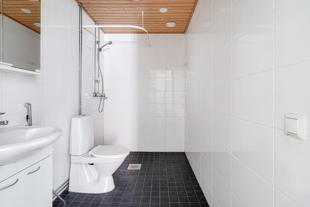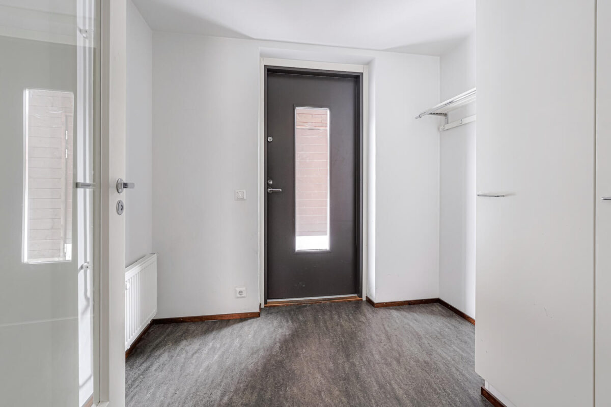 Säilytystilat on suunniteltu suuremmankin perheen tarpeisiin: makuuhuoneissa on kiinteät kaapistot ja ulko-oven edessä oma varasto, jonne mahtuvat niin polkupyörät, pelivälineet kuin harrastuskamatkin ilman jatkuvaa eteisessä kompastelua. Eteisessäkin on tilaa elämälle – kunnollisen kokoiseen tuulikaappiin mahtuu koko perheen kengät ja ulkovaatteet helposti ja siististi.