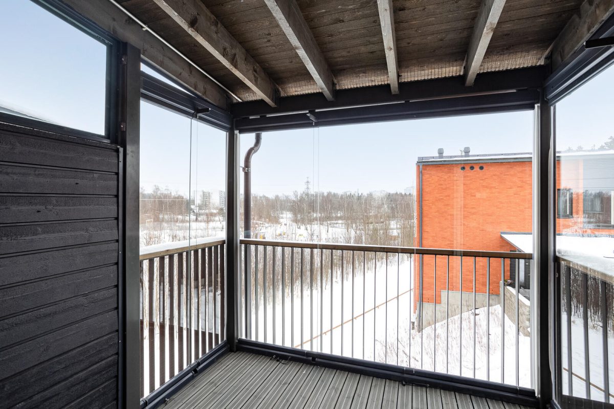 Arjen rentoutumiseen kotisi tarjoaa oman saunan sekä ison lasitetun parveketerassin — täydellinen paikka illanvietoille, treenin jälkeisille venyttelyille tai rauhallisille aamuille.