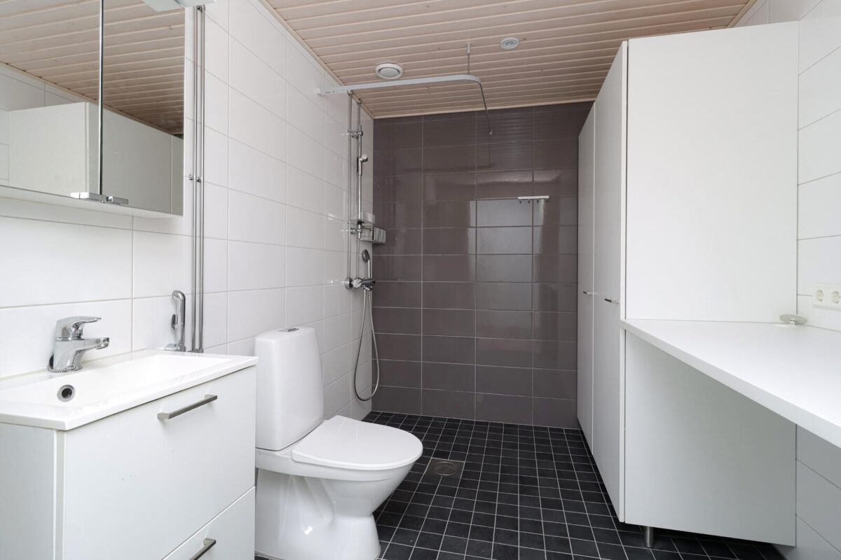 Kylpytilat ja sauna on laatoitettu keraamisella laatalla, mikä lisää käytännöllisyyttä ja ajattomuutta. Talon yhteistilat – kerhotila, pesutupa ja kuivaushuone – tukevat sujuvaa arkea ja tarjoavat lisämukavuutta asukkaille.