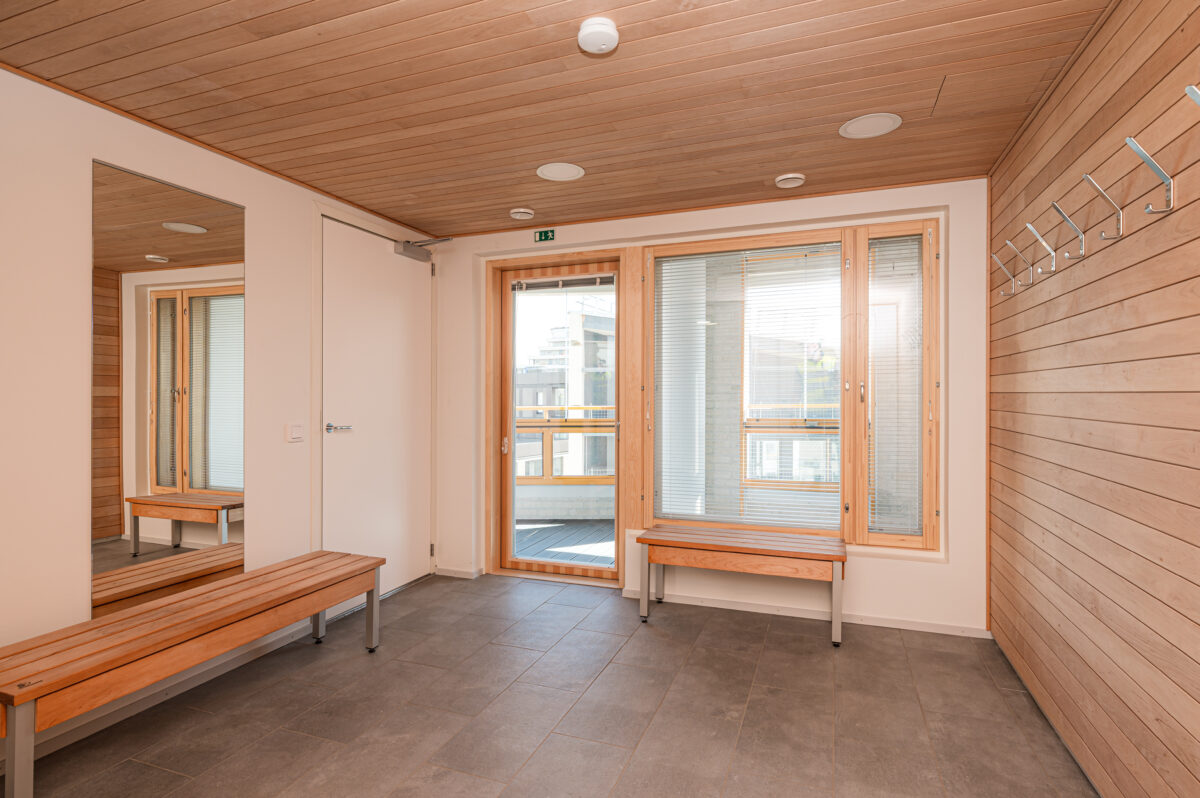 Talossa on yhteissauna, pesutupa, kuivaushuone ja kerhotila.