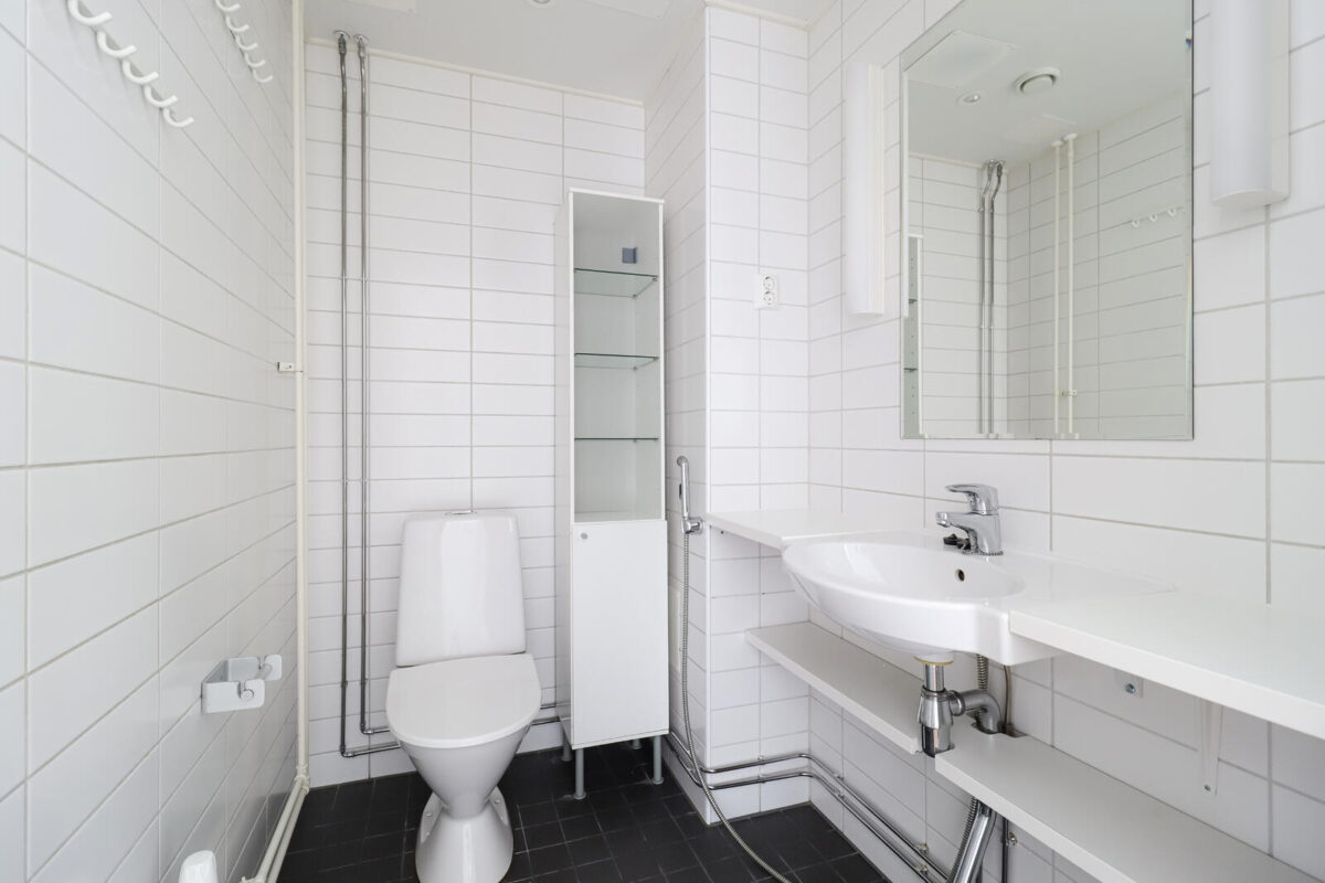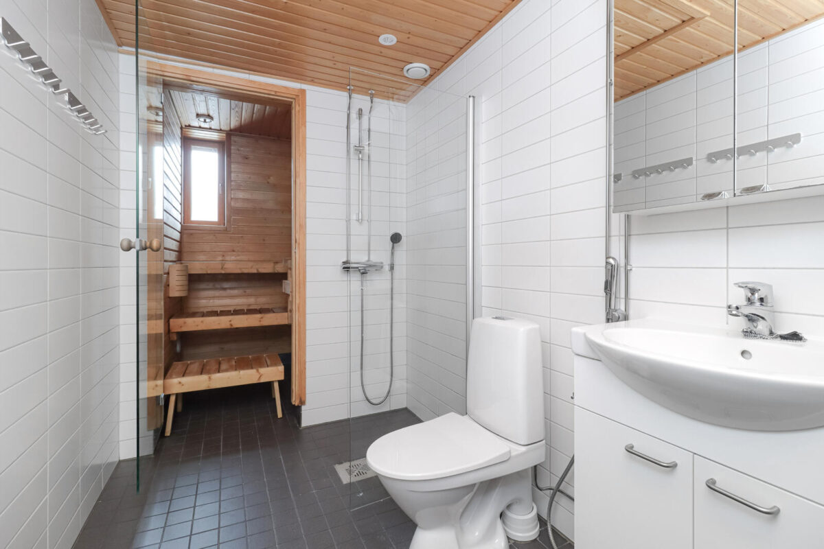 Kuivissa asuintiloissa on parkettilattia. Kylpyhuoneissa, saunassa ja erillisissä wc-tiloissa on keraaminen laatta. Kylpyhuoneissa on allaskaappi laminaattiovin sekä pyykkikomero. Kylpyhuoneissa on lisäksi peilikaappi ja varaus pyykinpesukoneelle ja kuivausrummulle liitäntöineen. Suihkutilassa on suihkuseinä.