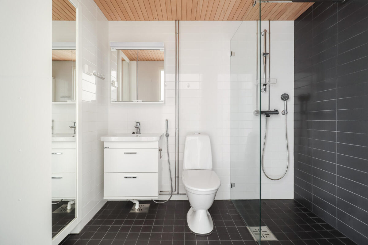 Kylpyhuone on varusteltu käytännöllisesti: allastaso alakaappeineen, peilikaappi ja pyykkikaappi tuovat runsaasti säilytystilaa. Pyykinpesukoneelle ja kuivausrummulle on omat liitännät. Kylpyhuoneessa on suihkuseinä ja saunan lauteet ovat tervaleppää. Lasitettu parveke tarjoaa viihtyisän lisätilan ympärivuotiseen käyttöön.