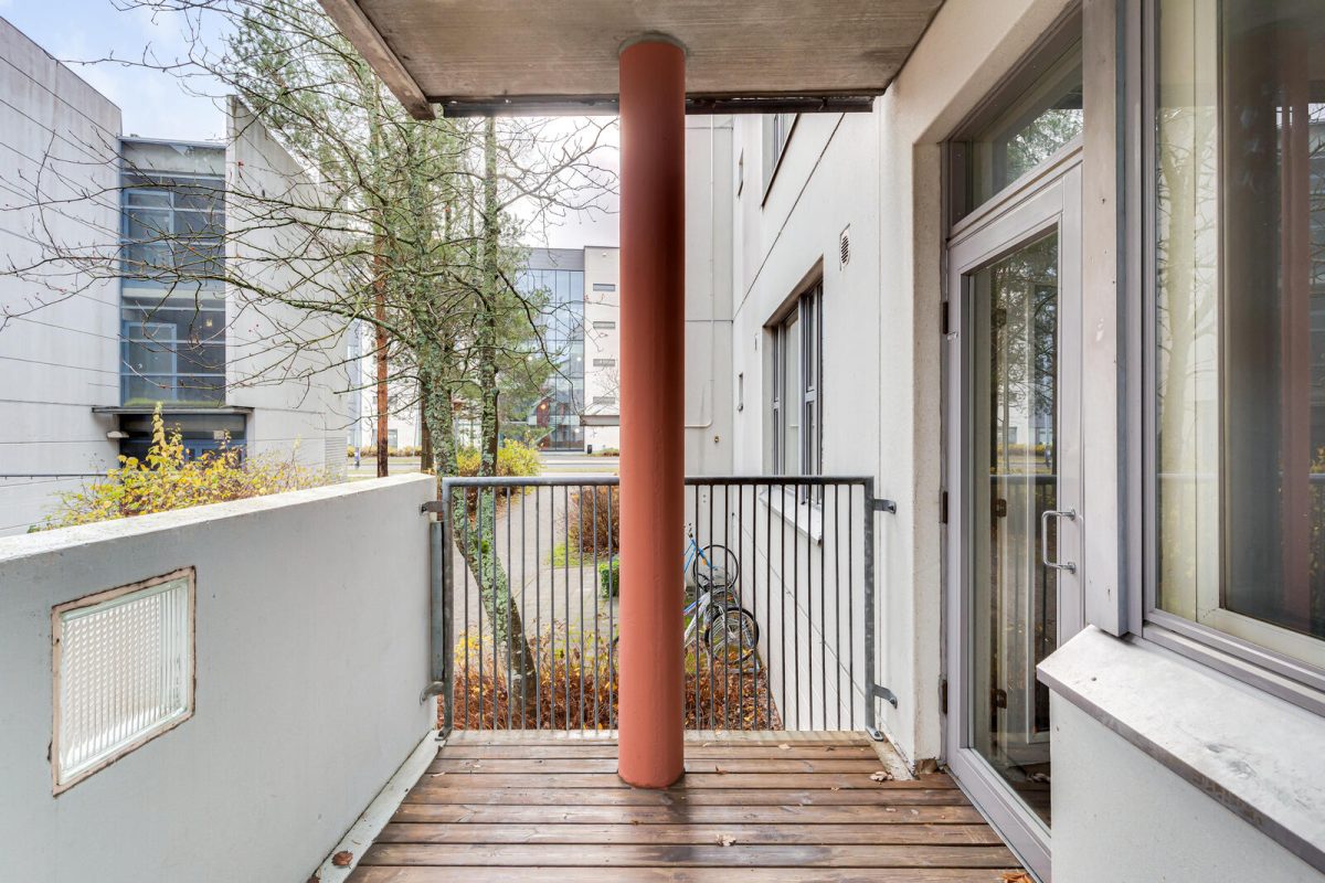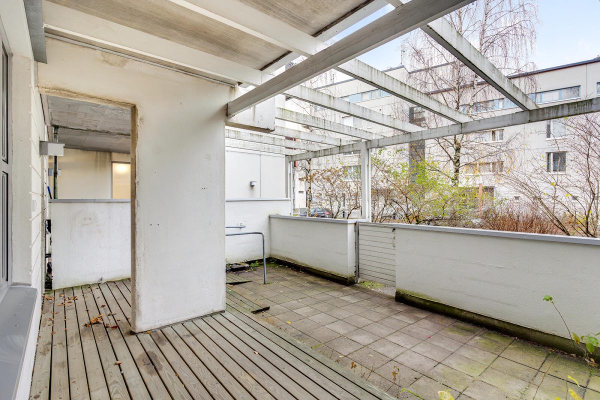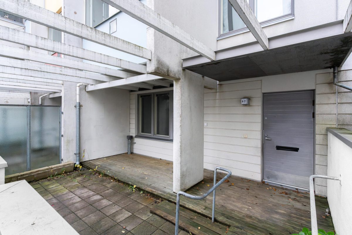 Asunnossa on laminaattilattiat, kylpytiloissa keraaminen laatoitus sekä oma sauna. Oleskelutiloista on käynti omalle pienelle terassipihalle, ja lisäksi asunnossa on parveke, mikä tarjoaa poikkeuksellisen paljon ulkotilaa kerrostaloasumiseen.