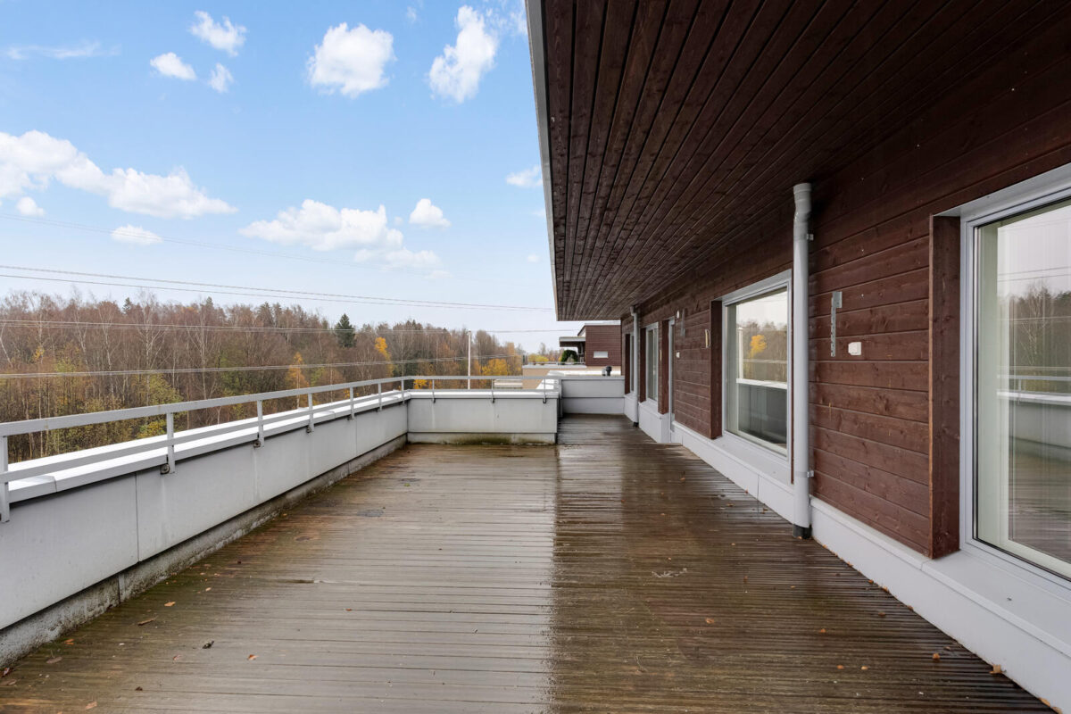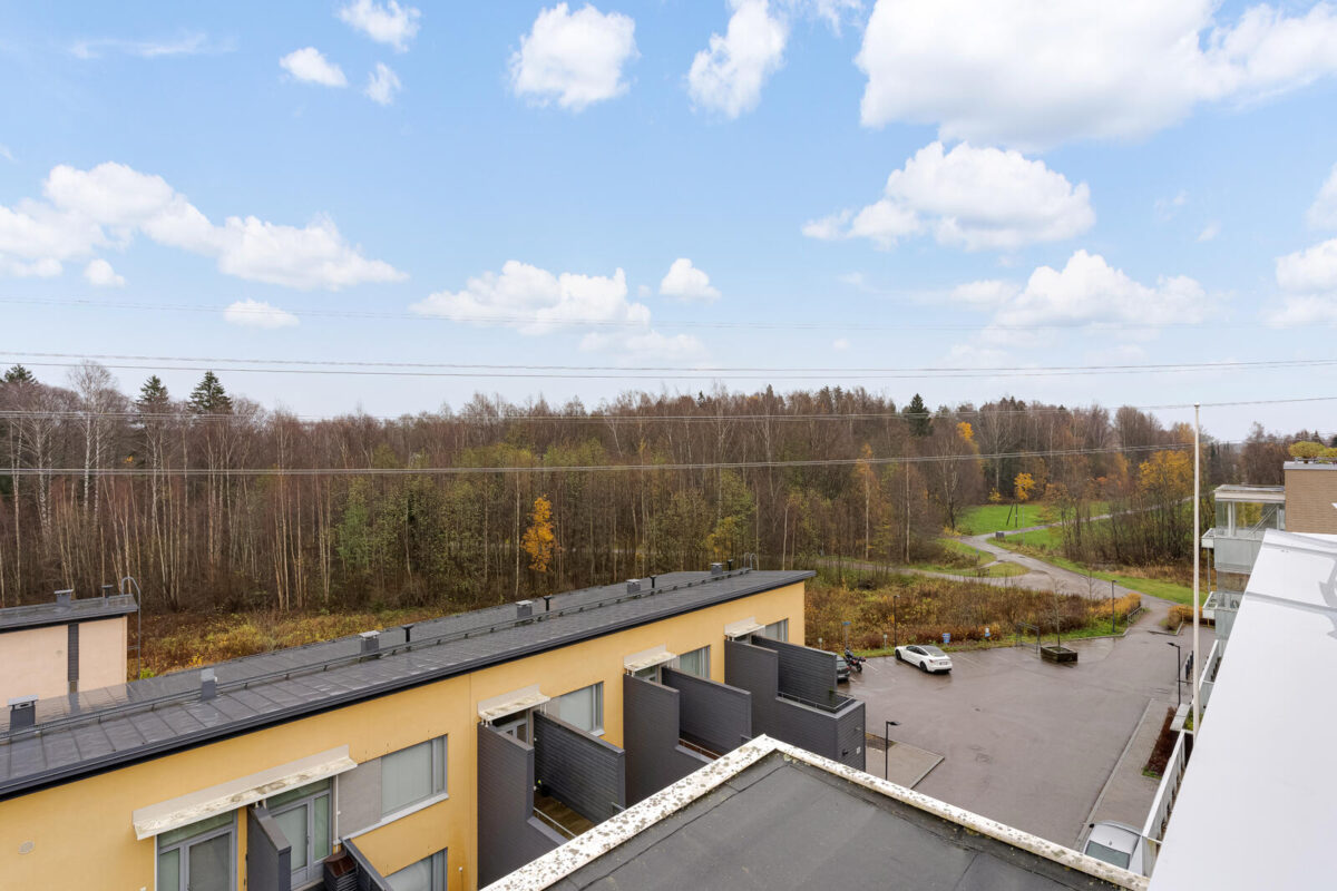 Olohuone avautuu suurelle parvekkeelle, joka toimii käytännössä lisähuoneena suuren osan vuodesta. Sinne mahtuu niin ruokapöytä kuin pieni oleskelunurkkauskin, ja näkymät viidennestä kerroksesta tuovat oman rauhallisen lisänsä.