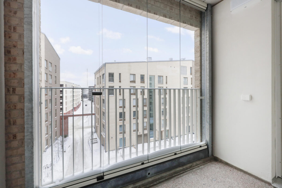 Lasitettu parveke tuo lisätilaa ja mahdollistaa oleskelun säällä kuin säällä, samalla kun vaatehuone helpottaa säilytyksen järjestämistä ja pitää kodin siistinä. Keittiö ja olohuone muodostavat yhtenäisen tilan, joka sopii niin arkeen kuin vierailijoiden kestitsemiseen.