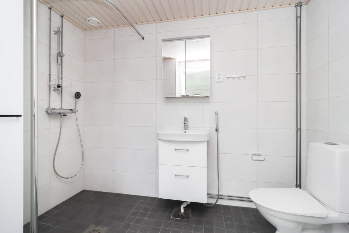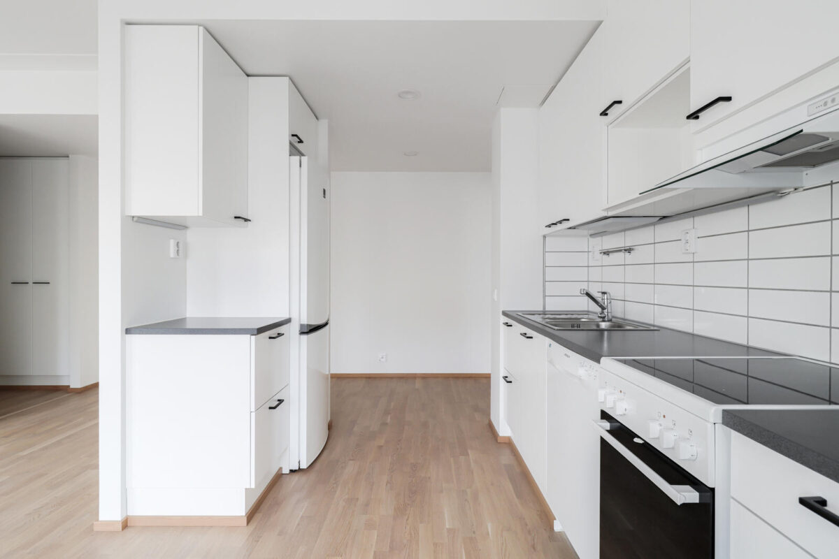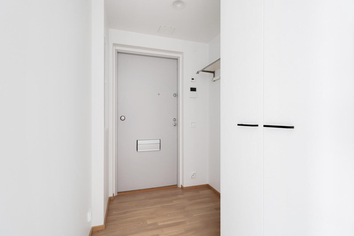 Tilava ja selkeä pohjaratkaisu tekee arjesta sujuvaa. Keittiö on toimiva ja käytännöllinen tummine vetimineen, ja kylpyhuoneessa on mukavasti tilaa. Reilunkokoinen makuuhuone säilytysratkaisuineen tarjoaa rauhallisen oman tilan, jossa on helppo hengähtää päivän päätteeksi.