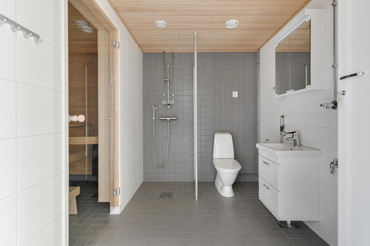 Lattiana on helppohoitoinen laminaatti, joka tuo yhtenäisen ilmeen kaikkiin kuiviin tiloihin. Kylpyhuoneessa ja muissa kosteissa tiloissa on ajaton laatoitus, joka on sekä käytännöllinen että kaunis ratkaisu.