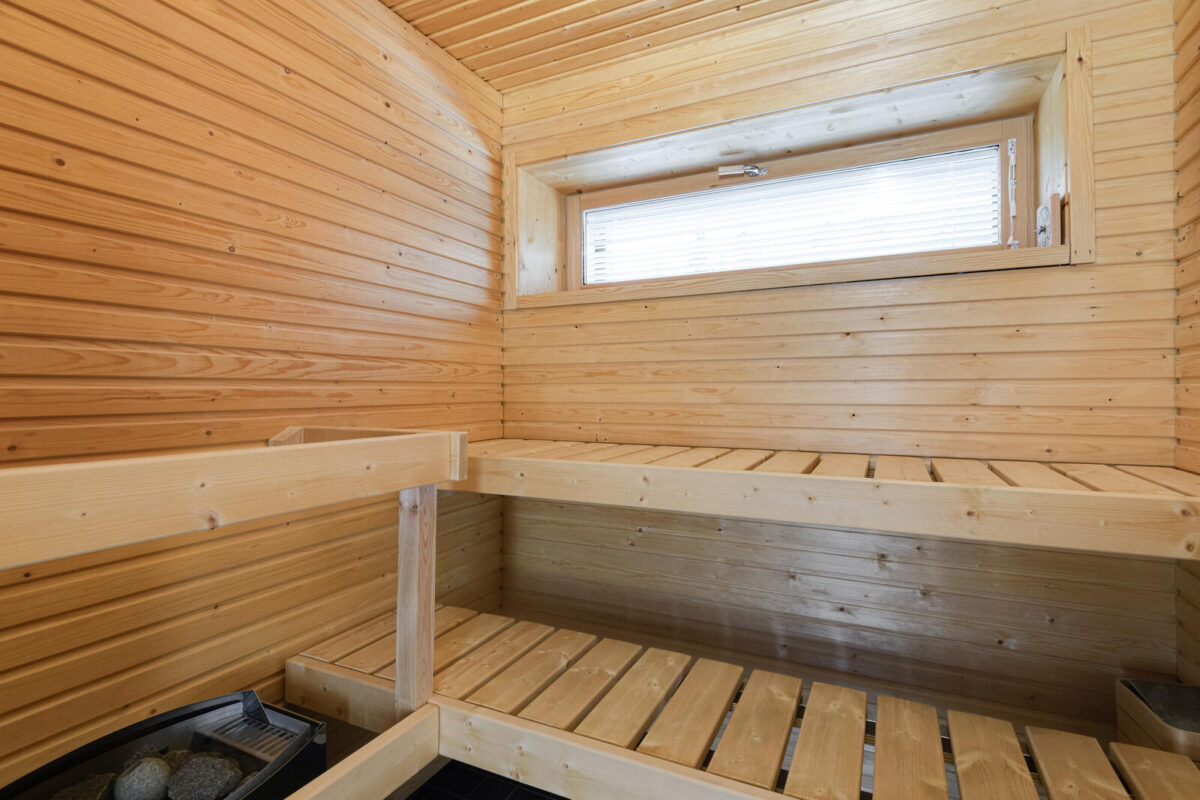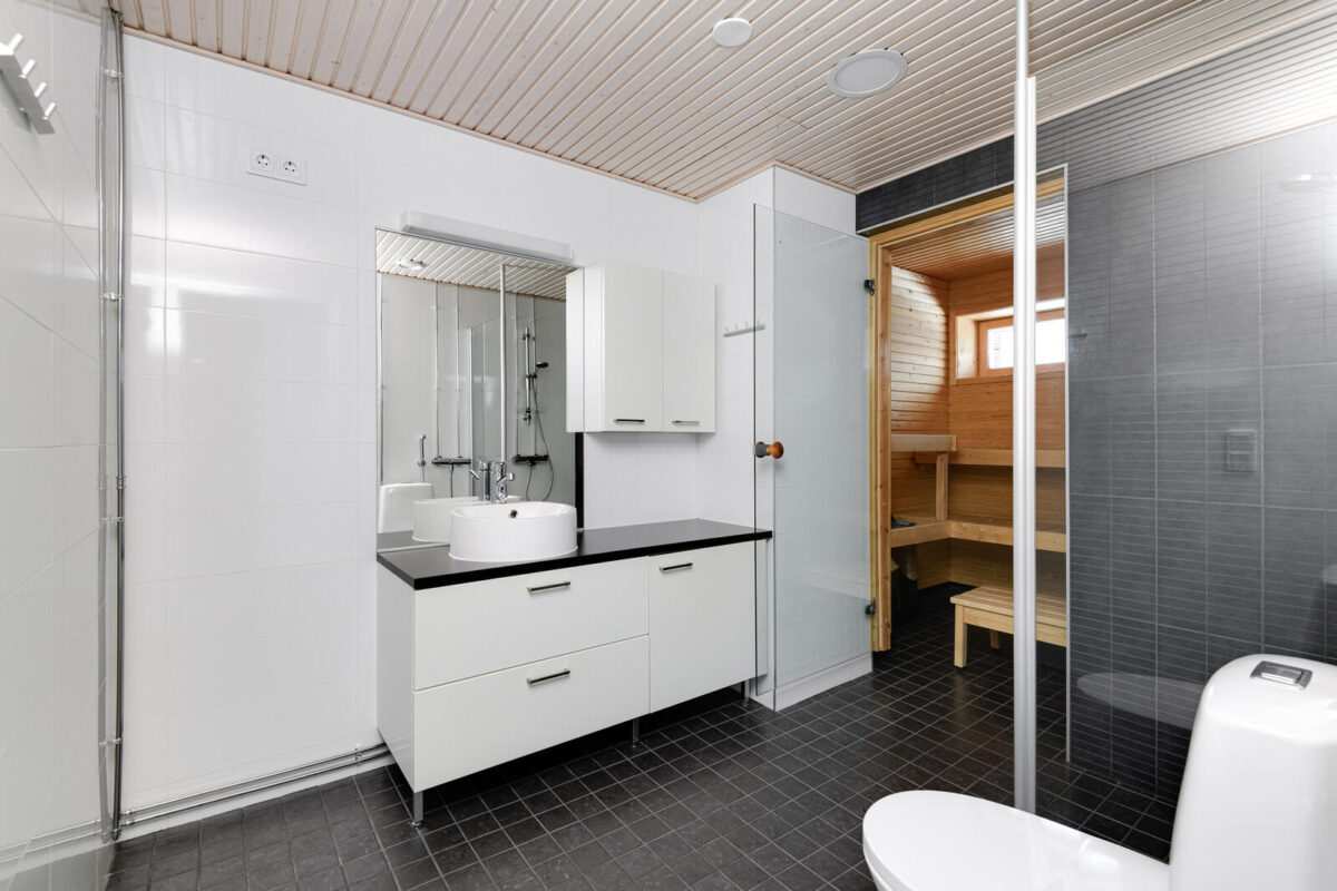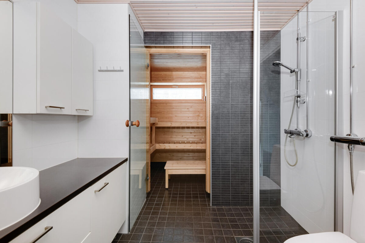 Keittiöratkaisuna on käytännöllinen keittonurkkaus olohuoneen yhteydessä tai olohuoneesta kevyesti erotettu keittotila, mikä lisää avaruutta ja joustavuutta sisustamiseen. Oma sauna tuo arkeen ripauksen luksusta vuoden ympäri.