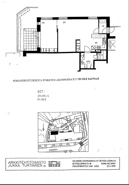 Huomaathan, että kohteen esitteen pohjapiirustuksissa kaikkiin asuntoihin on merkitty sauna. Huoneistoissa B27, B32 ja B38 on kuitenkin saunan kohdalla vaatehuone.