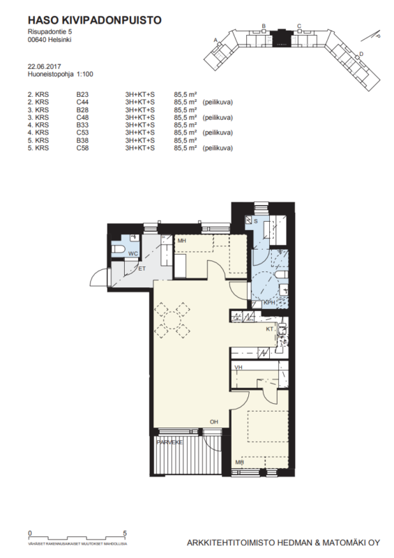 | Huoneistotyyppi | Pinta-ala m2 | Asuntoja | Vastike €/kk |