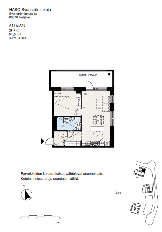 Svanströminkuja 1a A 11 on kolmannen kerroksen kaksio, jossa arki sujuu toimivassa pohjaratkaisussa. Avoin keittiö ja olohuone muodostavat viihtyisän kokonaisuuden, jota täydentää lasitettu parveke – mukava lisätila pitkälle keväästä syksyyn.