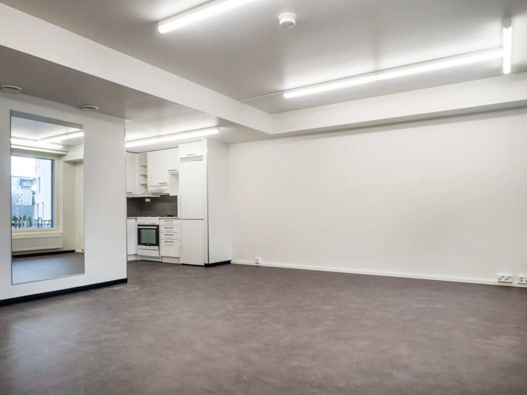 Avoin olohuone ja keittiö muodostavat yhtenäisen, avaran oleskelutilan, johon on helppo sijoittaa niin ruokapöytä kuin työpiste. Tilaa riittää myös kahdelle etätyöpisteelle, mikä tekee asunnosta erinomaisen vaihtoehdon pariskunnalle.